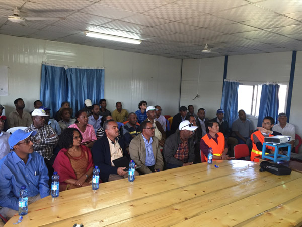 部長一行于上午10時許抵達后,在我項目部主營地召開了現(xiàn)場會議,埃塞公司副總經(jīng)理兼項目經(jīng)理黃生寶詳細的介紹了項目的進展情況及六大施工管理區(qū)的實施情況。并表示,盡管面臨著工期縮短、征地困難等諸多阻礙,我司一定會團結(jié)各方、迎難而上,完成施工任務(wù)為埃塞水利發(fā)展貢獻力量。