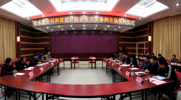 2013年11月13日,我公司與江西省水利規(guī)劃設(shè)計院合作開發(fā)非洲市場暨聯(lián)合成立“江西省水利規(guī)劃設(shè)計院埃塞俄比亞分院”簽約儀式在省水院會議中心舉行。江西省水利廳黨委書記、廳長孫曉山出席簽約儀式并作重要講話,我公司董事長兼總經(jīng)理王元旦、省水院院長孔俐麗分別致辭,并代表雙方簽訂戰(zhàn)略合作協(xié)議。
