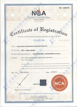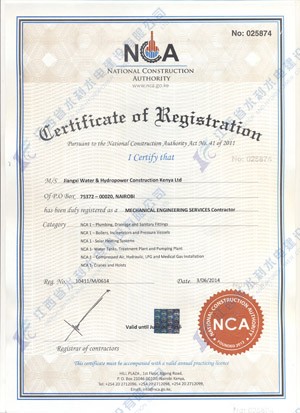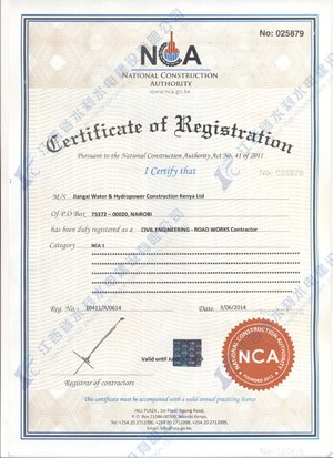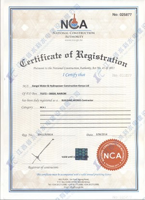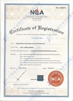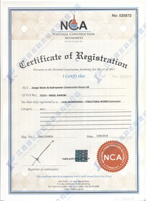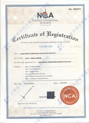 江西省水利水電建設有限公司肯尼亞分公司接到通告后,積極準備相關資料,憑借公司的技術實力和肯尼亞市場的良好業(yè)績,最終取得所有六項的一級證書。其中包括:水利施工一級,公路工程施工一級,房屋建筑工程施工一級,結構施工一級,電力工程施工一級和機電工程施工一級,有力地提升公司的品牌影響,提升了公司資信競爭力,為公司在肯尼亞各項工作的全面深入開展創(chuàng)造了積極有利的條件。