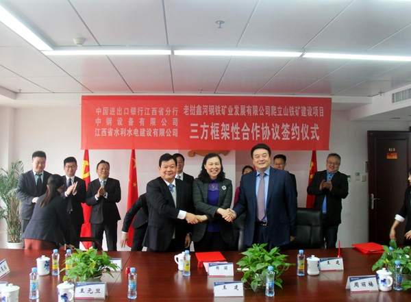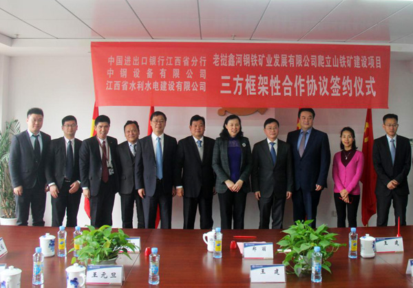12月29日上午,在江西省商務(wù)廳副廳長方向軍、外經(jīng)處處長王健的見證下,公司與中國進出口銀行江西省分行和中鋼設(shè)備有限公司就老撾鑫河鋼鐵礦業(yè)發(fā)展有限公司爬立山鐵礦建設(shè)項目正式簽訂三方框架性合作協(xié)議。中國進出口銀行江西省分行行長鄭麗、中鋼設(shè)備有限公司總經(jīng)理王建、公司董事長王元旦、海外公司總經(jīng)理黃鄭民等出席簽約儀式。