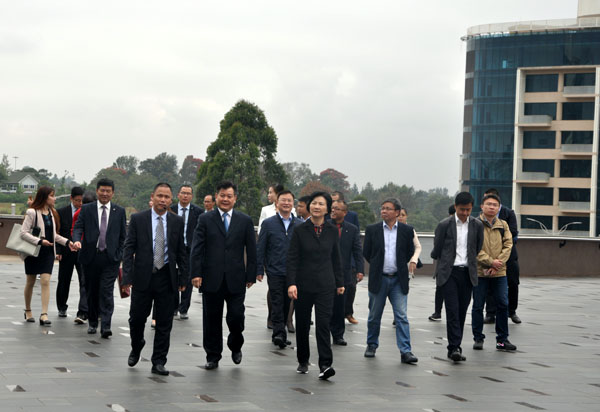 訪問團(tuán)一行首先參觀了雙河商貿(mào)中心,對雙河項目給予了充分肯定。座談期間,公司董事長王元旦及江西國際、江西中煤等駐肯企業(yè)代表逐一就企業(yè)在肯尼亞的發(fā)展情況進(jìn)行匯報。馮桃蓮主任充分贊揚(yáng)了江西企業(yè)在肯尼亞的各項優(yōu)秀業(yè)績,同時指出,在省委、省政府的正確領(lǐng)導(dǎo)下,希望各駐肯企業(yè)能夠緊密合作、抱團(tuán)發(fā)展,加強(qiáng)安全管控,提升企業(yè)抗風(fēng)險能力,樹立良好的企業(yè)形象。