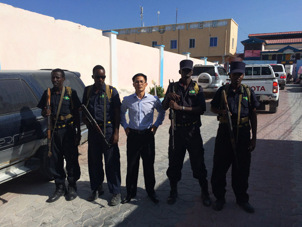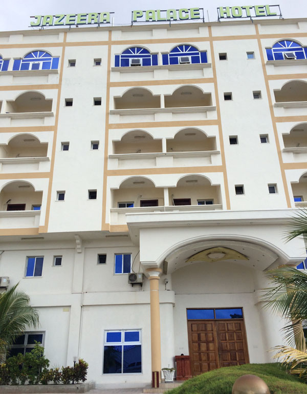 我們入住的是半島皇宮酒店,也是中國駐索使館的臨時辦公產(chǎn)所。三道門的安全防護可謂警備森嚴,戰(zhàn)爭國家的氣象從這可見一斑。酒店內布置簡單,但設施齊全,與酒店外充滿殺氣的氣氛不同,酒店內人來人往,商人喝著咖啡悠閑地談著生意。我們也坐著邊喝咖啡邊商談工作計劃,不時有索馬里人來打招呼,用中文說“你好”,并客氣地握手表示熱情歡迎來到摩加迪沙。