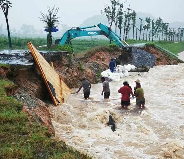 進入7月以來,昌江河流域普降暴雨,橋溪水河水位大漲。7月7日,公司接到業(yè)主汛情通報,已完工驗收工程多處出現(xiàn)險情;汛情就是命令,時間就是生命,公司迅速組建了一支裝備精良、經(jīng)驗豐富的專業(yè)搶險突擊隊,由副總經(jīng)理曾朝文、總經(jīng)理助理杜凌帶隊,連夜奔赴浮梁抗洪一線,組織設(shè)備、人員、材料進場,進行搶險救災(zāi)工作。